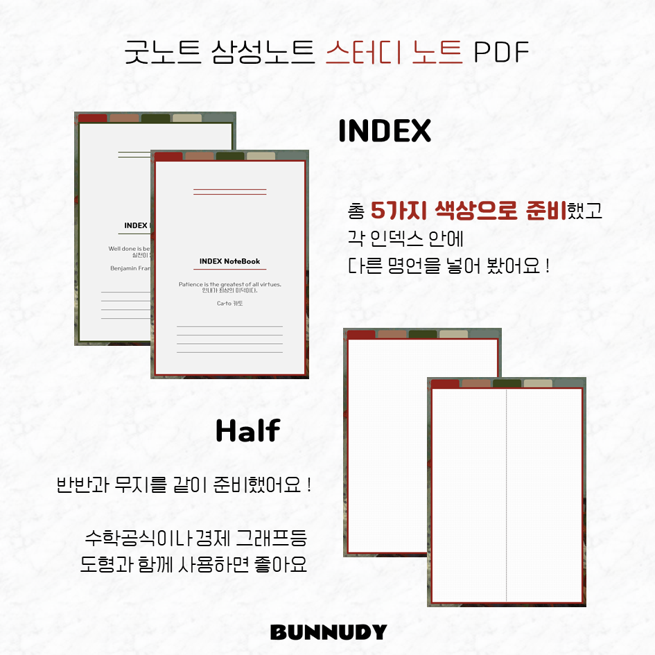 기본 구성 : INDEX (인덱스), half (반반) , quota (1/4) , note (줄공책) 2 type * 6